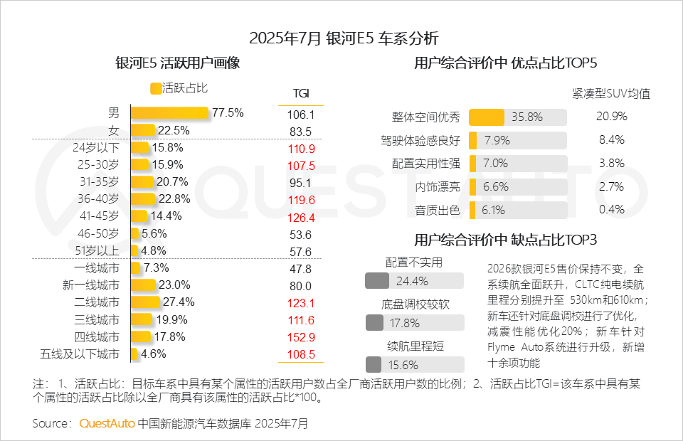 2、银河E5赢得下沉市场的青睐,以越级空间与精致内饰广获好评,同时针对用户反馈较多的配置实用性、底盘调校及续航里程等问题,2026款新车进行重点升级,产品力愈加均衡