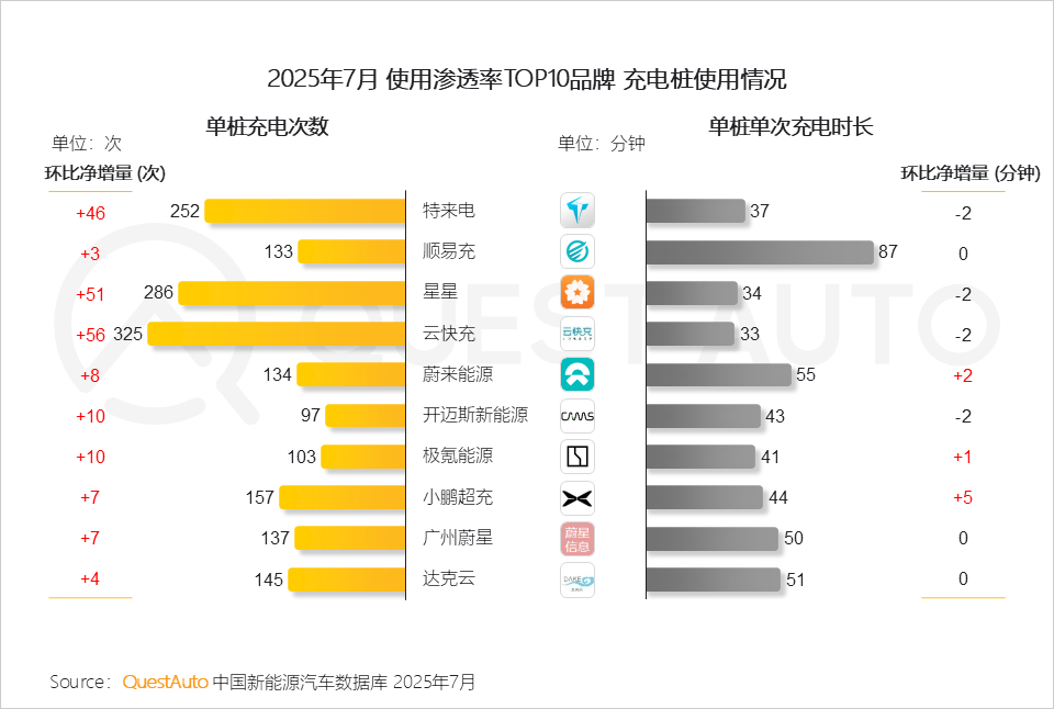 2、头部品牌充电桩的单桩充电次数均有提升,单桩充电时长保持稳定