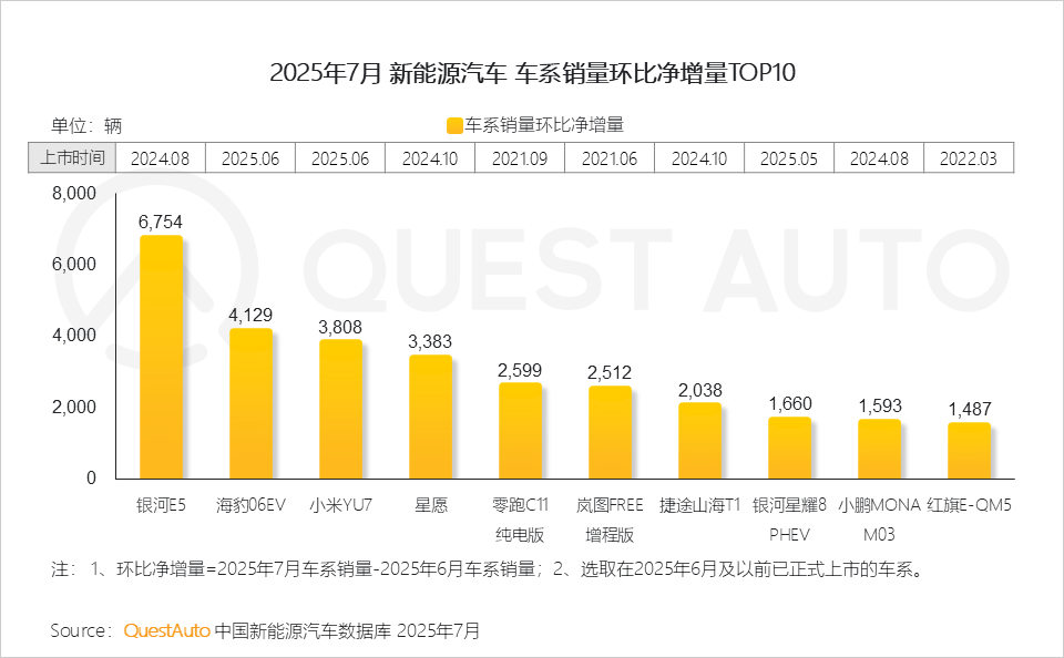 1、银河E5环比销量增幅领跑市场,比亚迪海豹06EV与小米YU7上市即爆款,上市次月销量迅速冲高