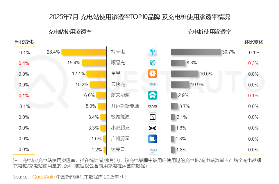 1、主流充电桩品牌使用率总体格局稳定,绝大多数品牌环比持平,顺易充与蔚来能源成为唯二增长品牌