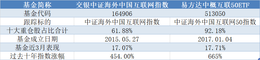 从跟踪标的的选择来看,交银跟踪的是中证海外中国互联网指数,而易方达跟踪标的为中证海外中国互联网50指数。