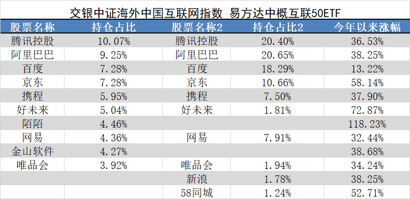 查看两只指数的最新成分股可发现,成分股名单并无二致,均由39只互联网中概股组成。