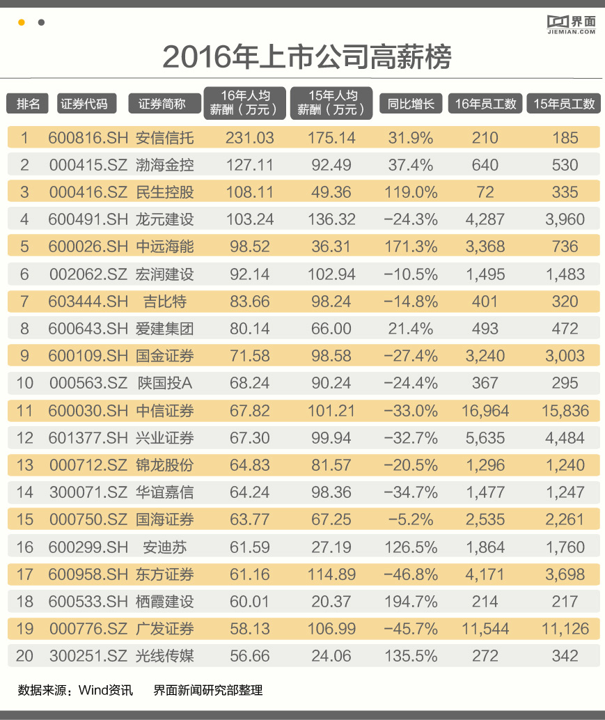 值得注意的是,安信信托、渤海金控、民生控股以及龙元建设(600491.SH)的2016年工资均超过了百万级别。从全行业看,共有34家上市公司年人均收入超过50万元,超过20万元的有395家,25家上市银行全部在此列。