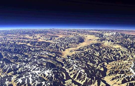 (图片描述:帕米尔高原以及最右侧的塔克拉玛干沙漠边缘部分,喀喇昆仑公路蜿蜒在世界最高的群山之间;引自:http://mt.sohu.com/20150511/n412844240.shtml)