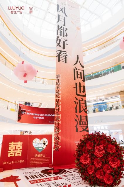 除此之外,在七夕佳节前夕,新城控股集团安康吾悦广场3米的巨型玫瑰花束浪漫呈现,成为全城关注的焦点。情侣们在这浪漫的花束前甜蜜合影,将这份爱意定格成永恒。抖音、小红书等社交平台上,网友们纷纷分享自己的打卡照片,让这份浪漫在网络上迅速传播,成为全城热议的浪漫盛事,亦吸引众多市民前来打卡,为广场带来持续的人气与流量。