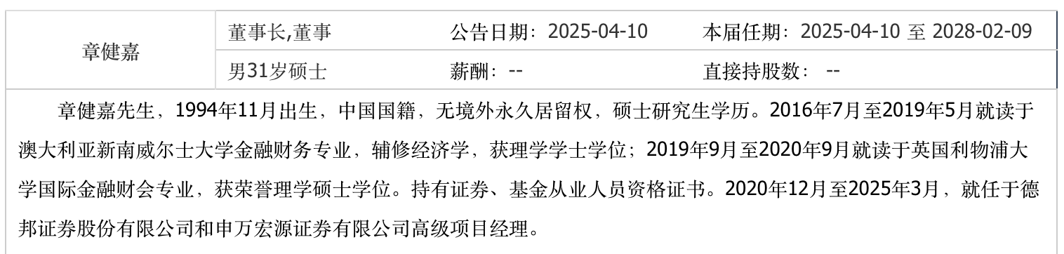 今年4月,飞鹿股份实控人章卫国曾唤回自己的儿子章健嘉来接班董事长,自己改任终身名誉董事长。章健嘉1994年11月出生,2020年12月至2025年3月曾任德邦证券和申万宏源证券高级项目经理。德邦证券是飞鹿股份的上市保荐人。