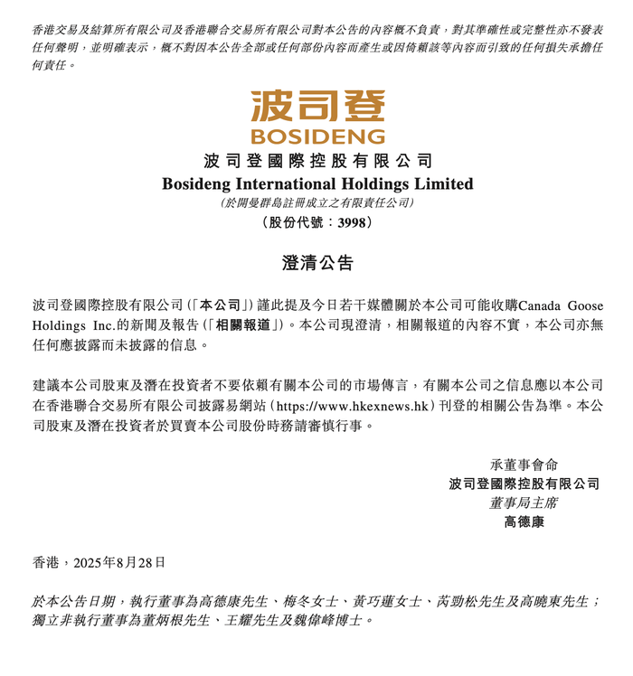 8月29日,波司登在港交所公告,公司谨此提及今日若干媒体关于本公司可能收购Canada Goose Holdings Inc.的相关报道。本公司现澄清,相关报道的内容不实,公司亦无任何应披露而未披露的信息。