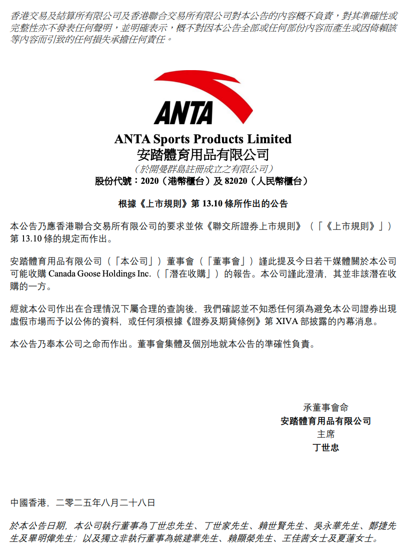 此前一天,安踏体育在港交所公告,谨此提及今日若干媒体关于本公司可能收购加拿大鹅控股有限公司的报告,本公司谨此澄清,其并非该潜在收购的一方。