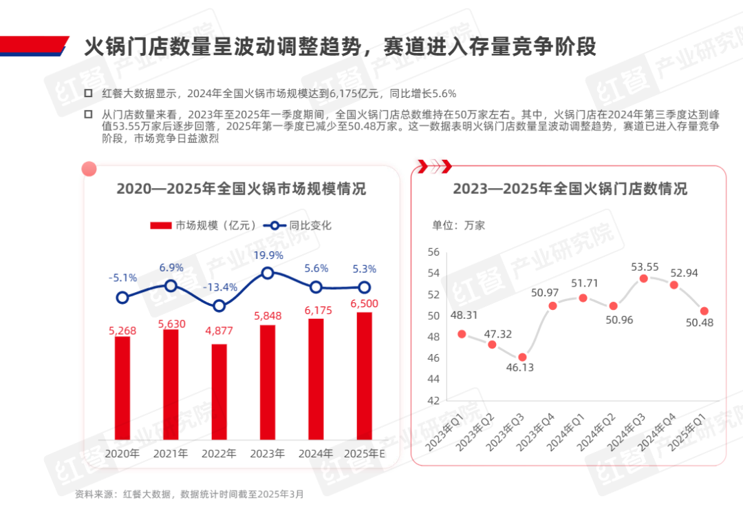 数据显示,火锅门店在2024年第三季度达到峰值53.55万家后逐步回落,2025年第一季度已减少至50.48万家。