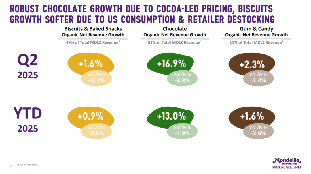 亿滋国际在2025年上半年实现营收183亿美元,同比增长3.8%。其中第二季度净收入增长 7.7%,主要得益于有机净收入增长5.6%和收购恩喜村带来的增量净收入。