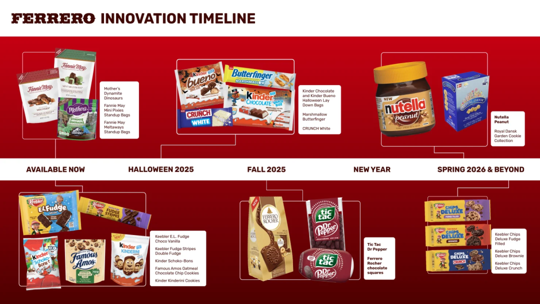 产品创新上,费列罗延续了其在资本上的大手笔风格。5月,费列罗北美宣布在Sweets &Snacks Expo上推出其有史以来最大的产品创新系列。其中包括: