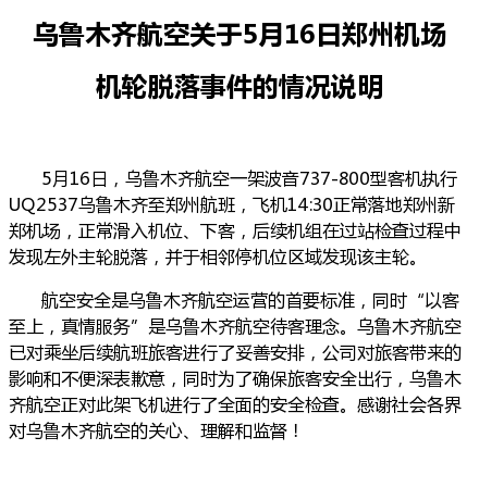 5月17日凌晨,乌鲁木齐航空的官方微博对5月16日郑州机场机轮脱落事件的情况做出说明。通报中并未提及机轮脱落的原因,该公司表示正对此架飞机进行全面的安全检查。