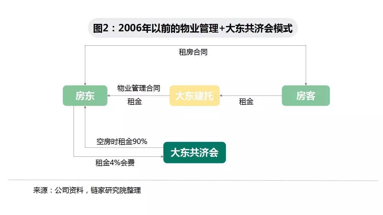 2006年,日本修改《保险业法》,大东互助会房租保险面临被取缔的危机,大东建托采用包租模式替代原先的房租保险。尽管两种模式都旨在为业主提供空置期房租保障,但新模式下,大东建托额外承担了房屋退租清扫、维修、整理的费用。同期大东建托大力推广从土地建设开始的“建造+包租运营”全套解决方案的业务模式,为土地主量身定制租赁住宅的建设方案,并与业主签订长达35年的包租合同。