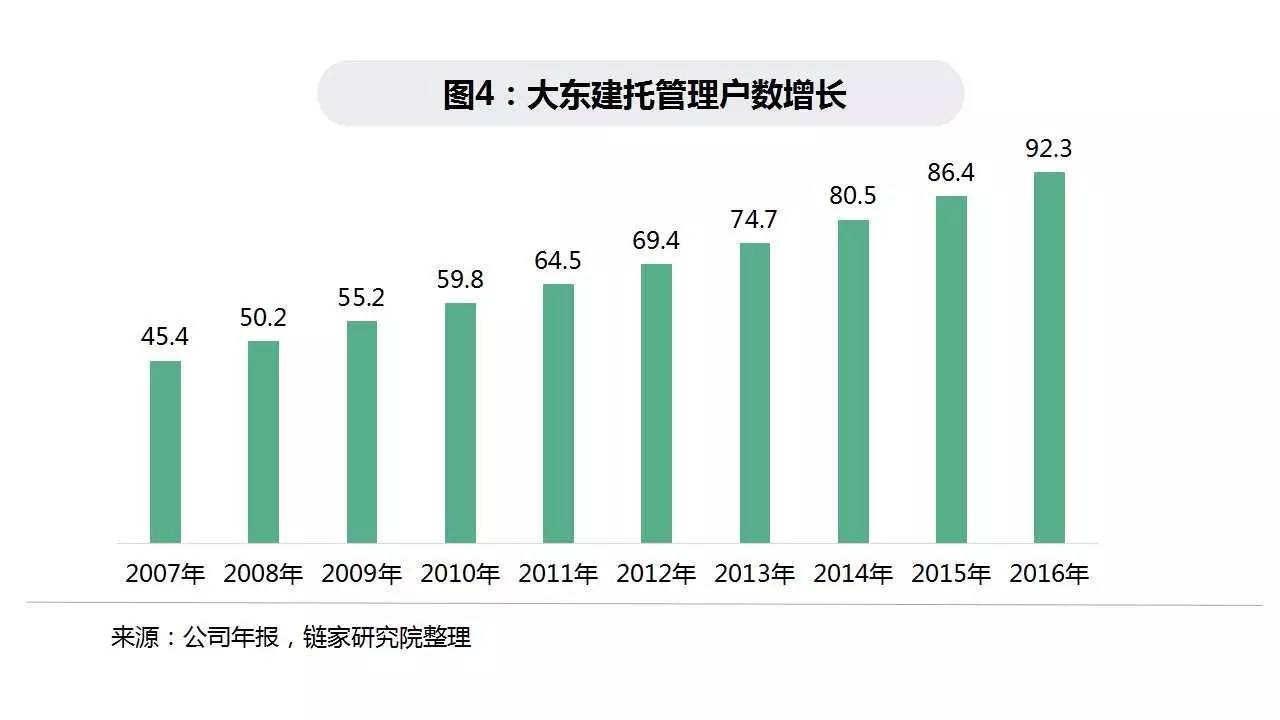 大东建托始终以轻资产的模式扩张,主要体现在:①大东建托的建筑施工全部外包,将重点放在前端的销售、市场分析;②业主付费,实行包租模式之前,大东建托仅负责轻资产的管理部分,实行包租之后大东建托承担了中途维修费用,尽管成本有所增加,仍然属于轻资产模式。