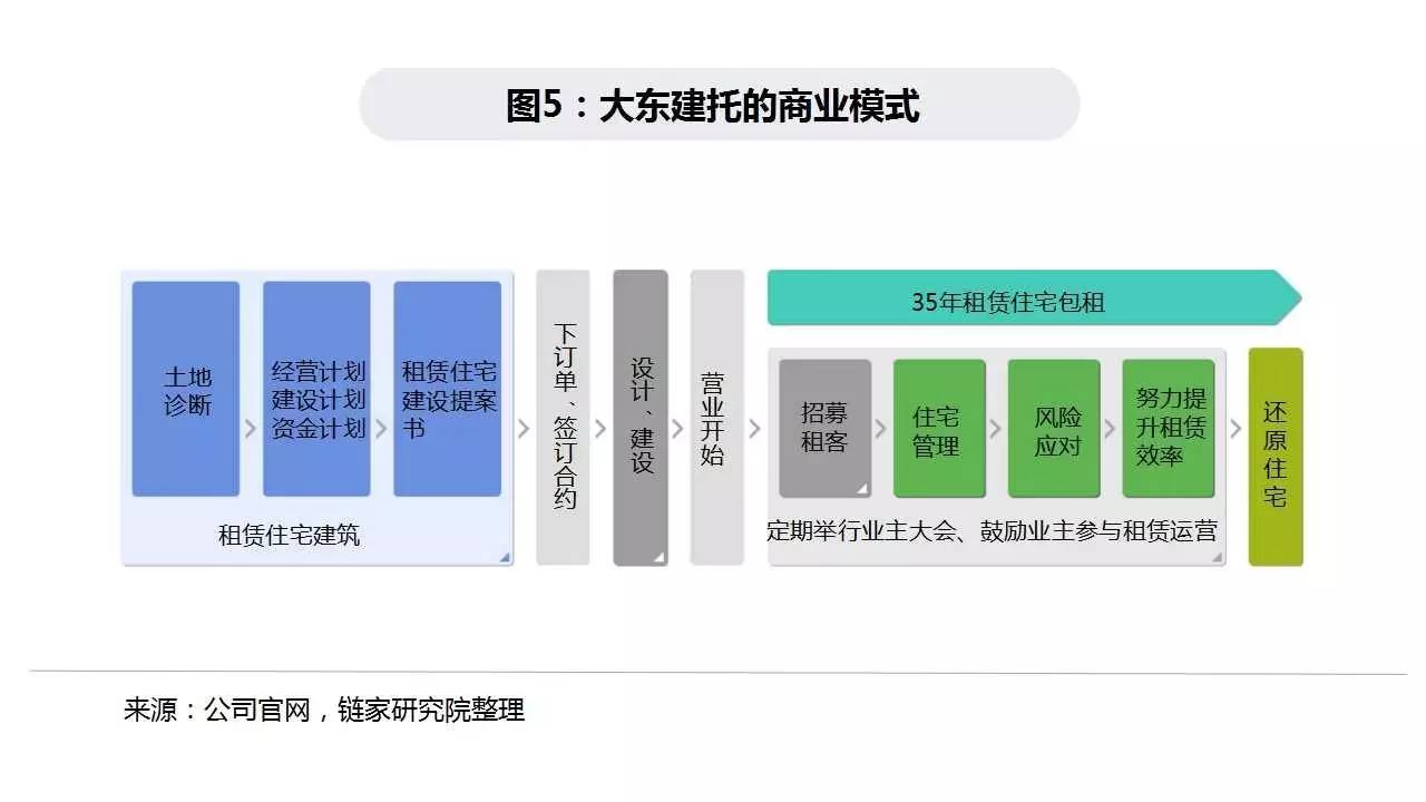 大东建托商业模式为通过向土地主提供咨询到施工的建筑业务,延伸至以包租为主的一站式资产管理,并辅以房屋的修缮及中介业务。