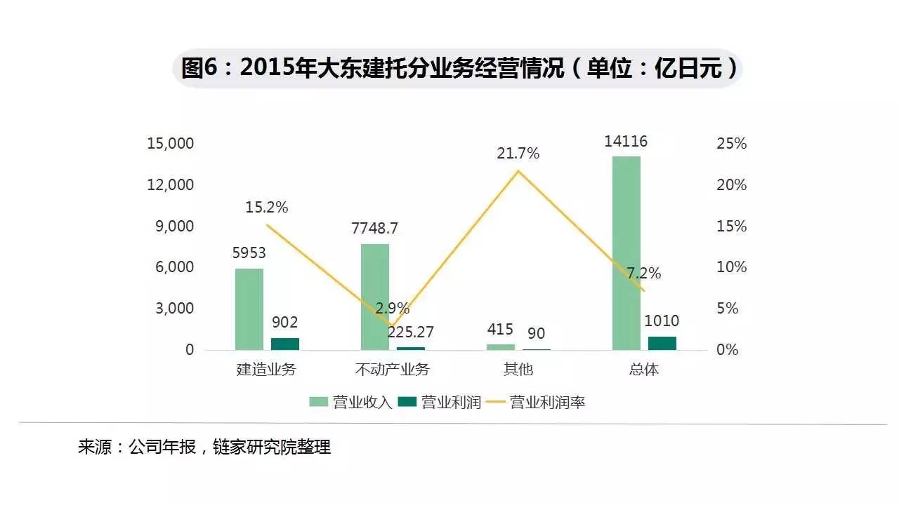2015 年大东建托总营业收入1.4万亿日元。其中,建筑业务收入5953亿日元,占比42.2%,营业利润率15.2%,完工房屋中98%为租赁住宅;不动产业务收入7748亿日元,占比54.9%,但营业利润率仅为2.9%,远远低于建造业务与其他业务。不动产业务收入构成中,包租业务占92%,维修工程占4.1%,中介业务占2%。托管住宅的入住率达96.7%。