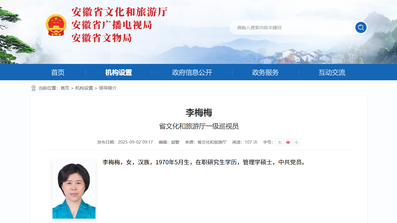 据安徽省文化和旅游厅官方网站“领导简介”一栏更新显示,李梅梅已任省文化和旅游厅一级巡视员。