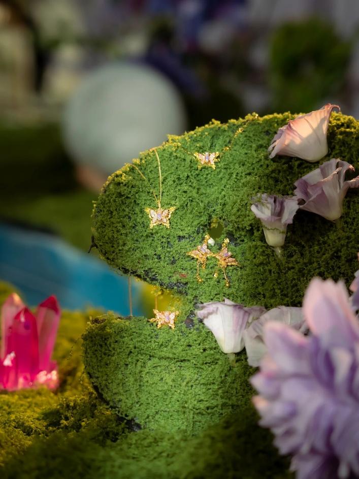 此次推出的“荧光珐琅+闪动工艺”,代表了周大生在黄金工艺上的再次突破。“荧光珐琅”是在周大生此前爆火的果冻珐琅基础之上,于珐琅颜料中增添环保光储能夜光原料,吸收光能后可在特定光源下展现迷人荧光效果;“闪动工艺”则通过创新性的弹簧结构实现珠宝的高频震颤,赋予其动态生命力。两者结合创新升级打造的「会动的金蝴蝶」吊坠,随佩戴者动作轻盈颤动,在光影间折射出如印象派画作般的绚烂色彩,实现了艺术性、佩戴性与工艺复杂度的三重统一。