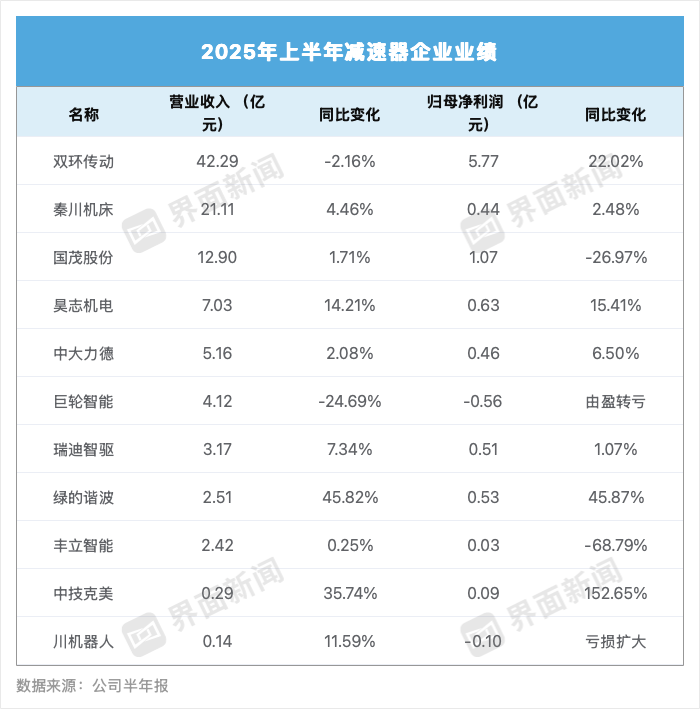 据界面新闻统计的11家上市减速器企业中,今年上半年,有2家亏损,7家实现净利增长,另两家净利下降。