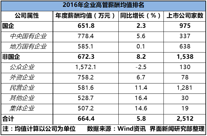 上述上市非国企高管薪酬均值计算时,为便于横向比较,未包含创业板上市公司数据,均值以公司为单位计算。可见几个明显的规律,一是整体高管薪酬不降反升,非国企同比增幅较国企高出6个点,限薪政策下增速差距明显。二是,2016年国企高管薪酬整体低于非国企,每家公司年均相差20.5万元。三是,央企高管薪酬高于地方国企,2016年央企高管薪酬均值为778.4万元,显著高于地方国企的585.1万元。四是,非国企中高管薪酬均值向中值靠拢,高薪的公众企业增速回落,其余类型企业均保持迅猛增速。总体来说,可以看出国企薪酬水平与非国企存在一定差距。