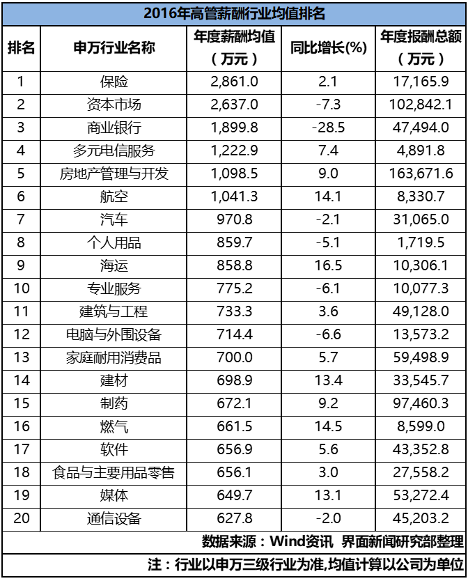 再将视线放到各行业板块,哪些是2016年高管薪酬最高的行业呢?