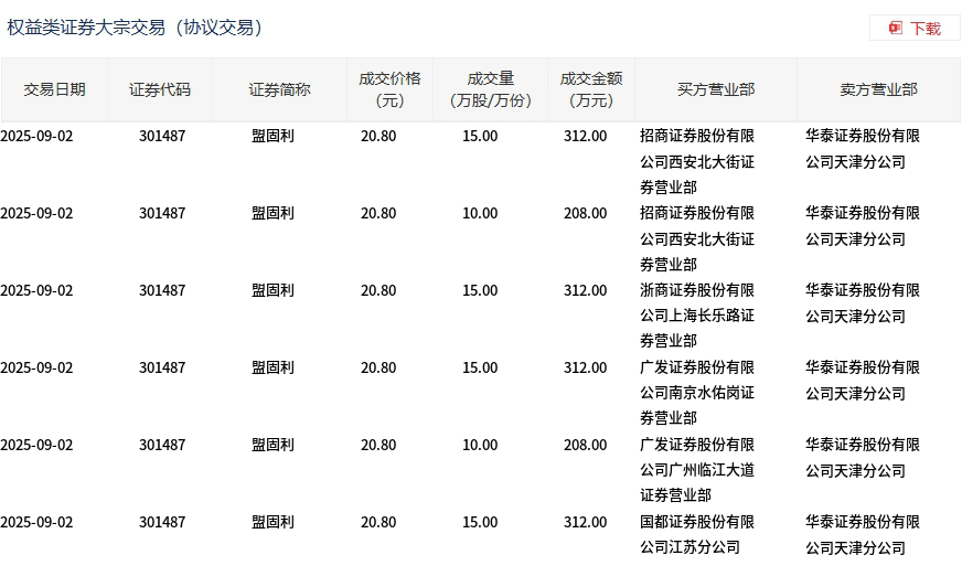 9月2日,盟固利大宗交易成交80万股,成交额1664万元,占当日总成交额的1.7%,成交价20.8元,较市场收盘价24.19元折价14.01%。