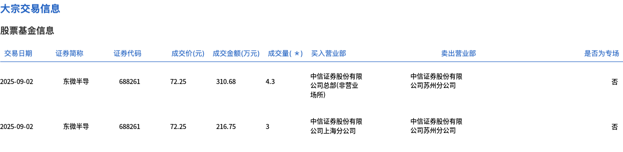9月2日,东微半导大宗交易成交7.3万股,成交额527.43万元,占当日总成交额的0.82%,成交价72.25元,较市场收盘价82.1元折价12%。