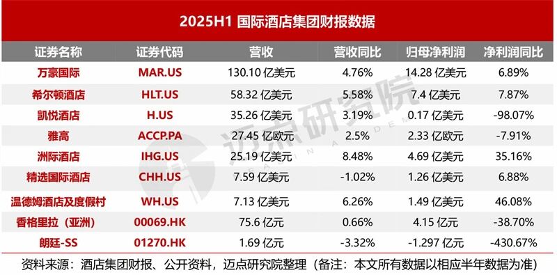 1. 2025H1国际酒店集团营收和利润情况:万豪国际集团持续领先,半年度营收超130亿美元