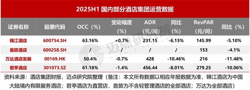 亚朵集团:未单独公布半年报经营指标,据其2025Q2财报显示,二季度,亚朵集团整体平均可出租客房收入(RevPAR)343元,为2024年同期的95.7%;日均房价(ADR)达433元,为2024年同期的98.2%;入住率(OCC)76.4%,为2024年同期的97.4%。即相比去年同期,三大经营指标同比亦呈下滑。
