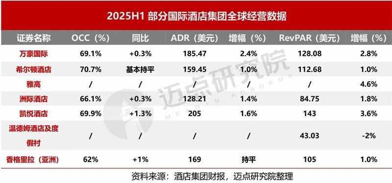 洲际:2025上半年,洲际酒店集团大中华区RevPAR同比下降3.2%,平均房价ADR下降3.6%,入住率增长0.3个百分点。截至上半年,洲际酒店大中华区开业及在建酒店总数超过1400家。