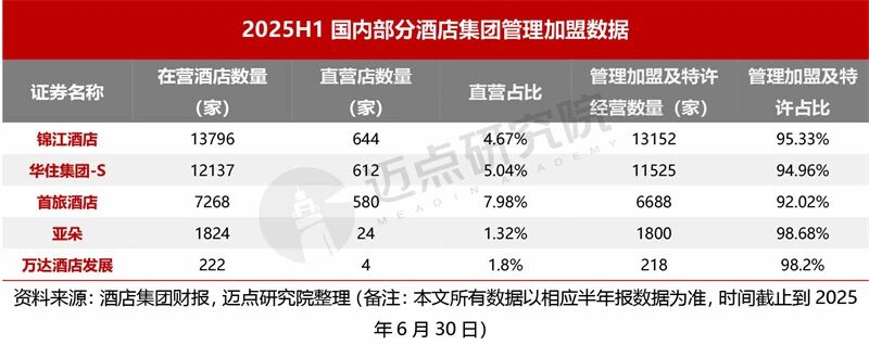 酒店规模与品牌拓展方面,上半年,国内各大酒店集团有序推进产品升级、新店开业,有力推动规模与品质的“双提升”,管理加盟和特许经营门店占比总体提高。截止2025年6月30日,锦江、华住、首旅、亚朵、万达酒店发展管理加盟酒店数量占比依次为95.33%、94.96%、92.02%、98.68%、98.2%。