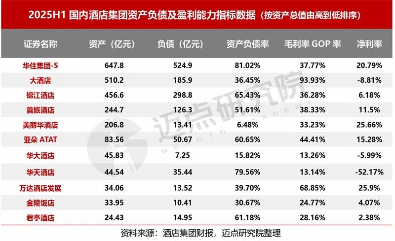 2.2025H1国内酒店集团负债水平和盈利能力情况:资产负债率均值48.05%,毛利率均值39.28%,净利率均值4.07%