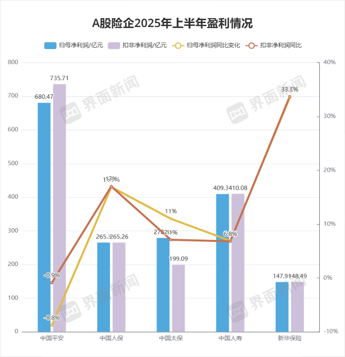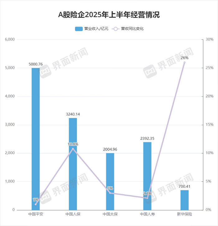 根据A股上市险企中国平安(601318.SH)、中国人保(601319.SH)、中国太保(601601.SH)、中国人寿(601628.SH)、新华保险(601336.SH)披露的半年报,上半年保险业整体经营情况较为稳健,营收均有所增长,但各家险企的业务展现出不同的发展态势,新华保险增速高于同业。