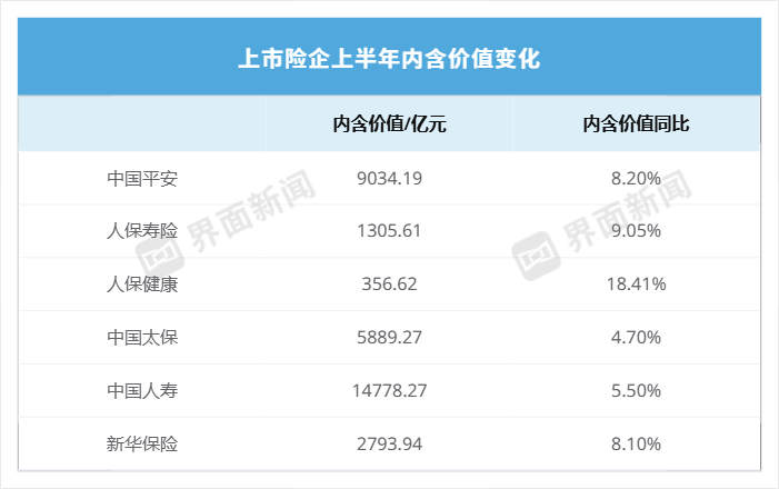 上半年,上述险企内含价值均实现增长。其中中国平安和新华保险增速较快,分别较年初增长8.20%和8.10%;人保寿险内含价值同比增长9.05%,人保健康同比增长18.41%。东吴证券认为,上市险企内含价值增速明显提升,主要是受新业务价值创造显著增长、以及营运经验和投资回报等差异正面贡献带动。