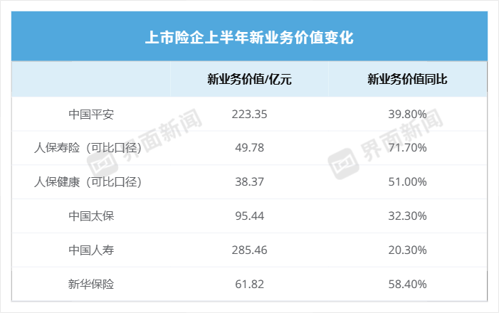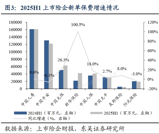 上半年,上市险企新单保费增速好于上年同期,大部分公司上半年新单保费实现同比增长。根据东吴证券统计,新华保险同比增长100.5%,大幅领先同业,中国平安同比下滑6.1%。