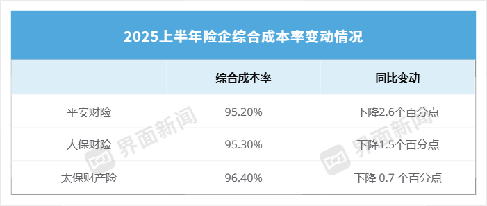2025年上半年,平安财险综合成本率95.2%,同比优化2.6个百分点;人保财险综合成本率为95.3%,同比下降1.5个百分点,创近十年同期最好水平;太保产险综合成本率为96.3%,同比下降0.8个百分点;太保财产险业务承保综合成本率为96.4%,同比下降0.7个百分点。