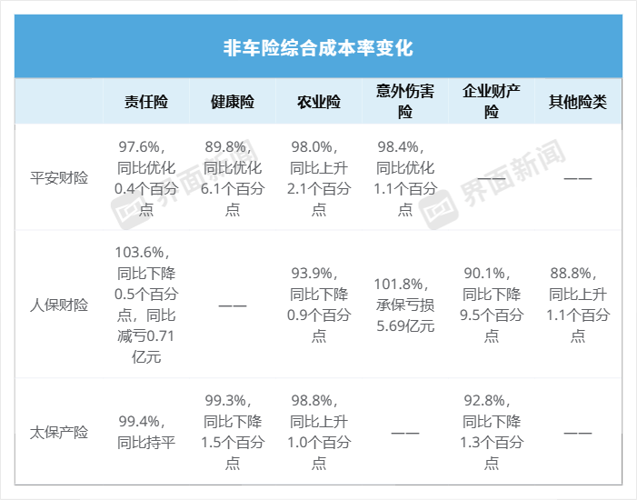 农业险中有同样表现的还有太保产险,综合成本率98.8%,同比上升1.0个百分点。其非车险整体承保综合成本率97.6%,同比上升0.4个百分点,剔除个人信用保证保险业务影响后,非车险承保综合成本率94.8%,同比下降2.3个百分点。其主要险种中,健康险实现扭亏为盈,但原保险保费收入同比下降3.8%。