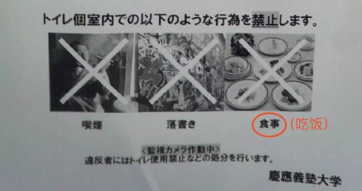 比如,在公厕里,如果你看到“禁止吃饭”的告示肯定会以为是哪家的熊孩子在恶作剧,但在日本却是稀松平常: