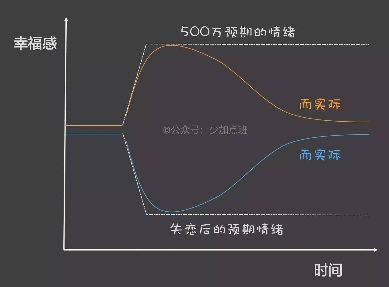 比如,你中了500万彩票,你预期的幸福指数会很高(下图虚线),但实际是你嗨了很短的一时间后,幸福指数复归平常(橙色);类似的,如果你不幸失恋,预期的幸福指数会很低,但实际上没多久你又能欢乐的飞奔在希望的田野上。
