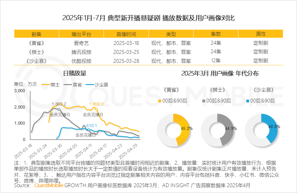 悬疑剧吸引了大量年轻人群,《黄雀》《棋士》《沙尘暴》中00后和90后用户占比超过40%。