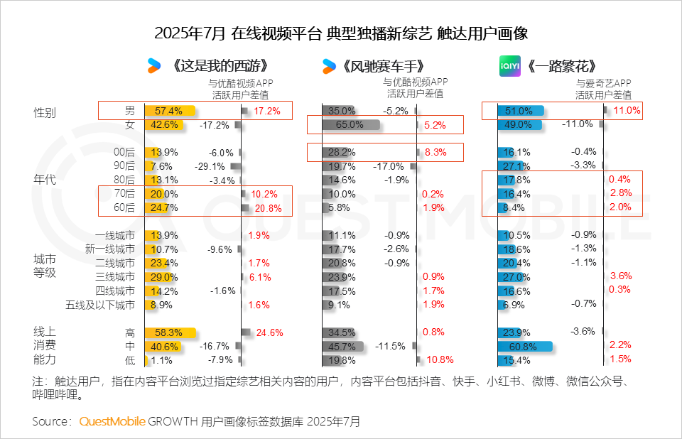 新综艺中,拥有一定国民认知度的银发嘉宾参演的综艺《这是我的西游》《一路繁花》对中老年男性人群具有一定吸引力,《风驰赛车手》顺应年轻人新潮消费需求-赛车文化,破圈吸粉,成功捕捉社会情绪与用户情感诉求,满足碎片时代下用户多元的情绪需求。