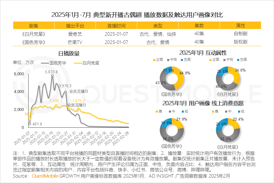 QuestMobile数据显示,古偶剧《白月梵星》《国色芳华》触达用户中,线上消费意愿中、高用户合计占比超过70%。