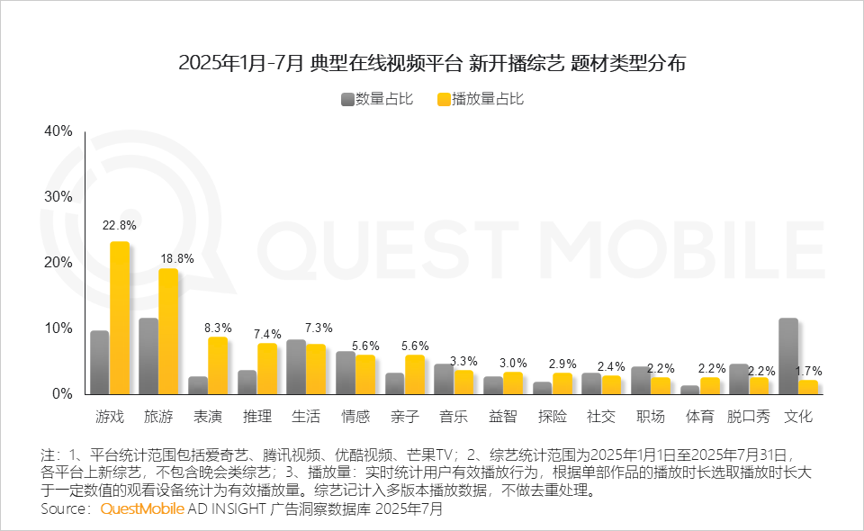 1.3 从综艺题材看,游戏类、旅游类、表演类成为拉动播放流量的“三驾马车”