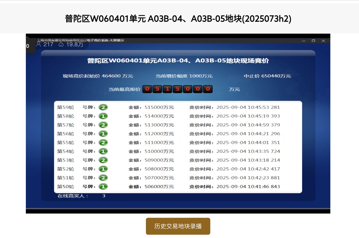 9月4日上午,普陀区W060401单元A03B-04、A03B-05地块被摆上拍卖桌,现场吸引了上海城建、中海、招商蛇口共3家竞买人参与竞价。