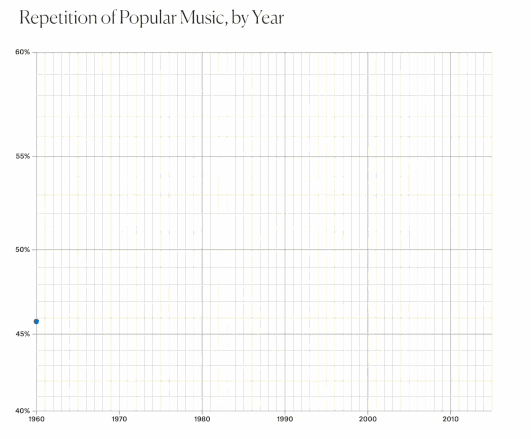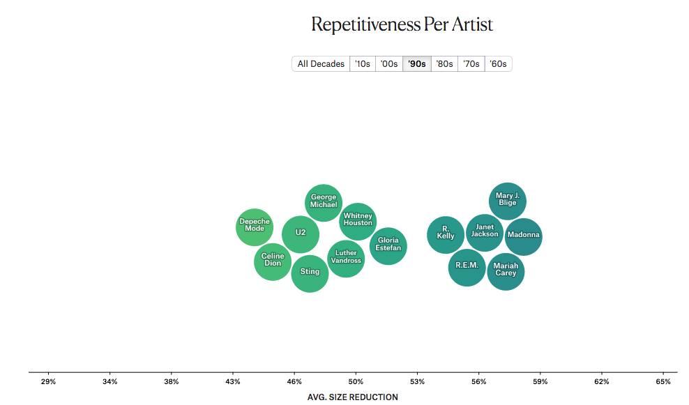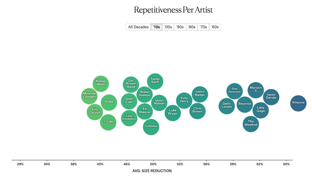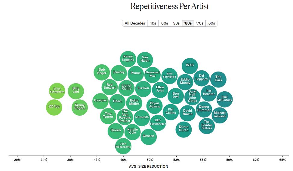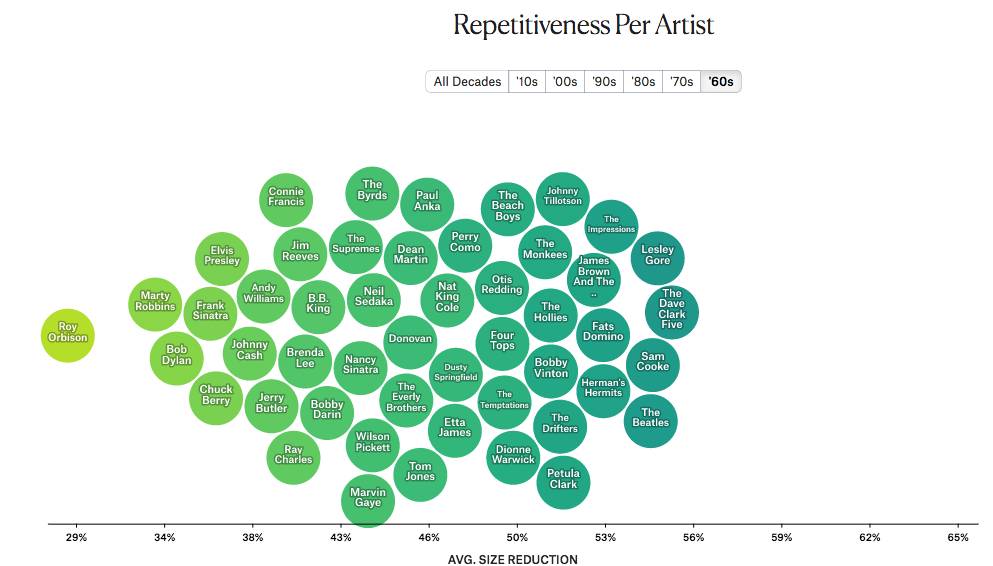 用这样的方法,他分析了15000首歌,挑选的范围是1958-2017年的Billboard Hot100上榜金曲。