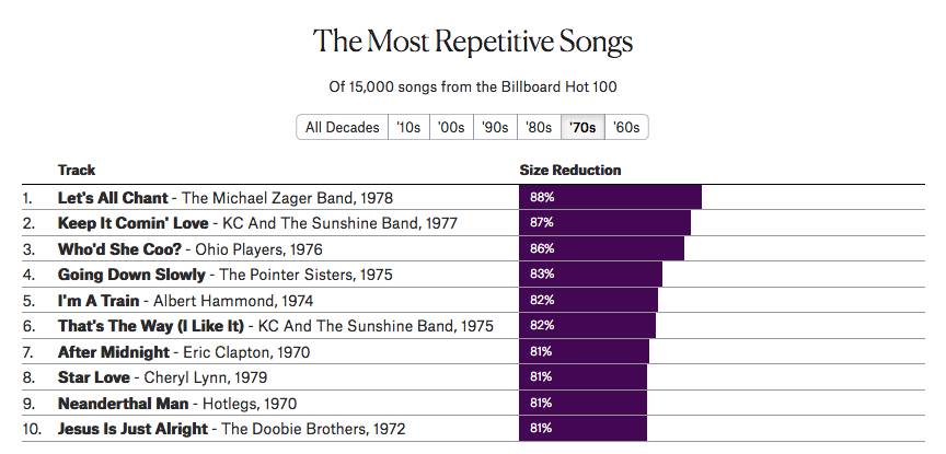 最后,我们的男猪脚把所有数据集结成库,进行了分析,得出结论:1960年代以来,流行音乐的歌词重复度不断上升,其中TOP10金曲表现特别明显。