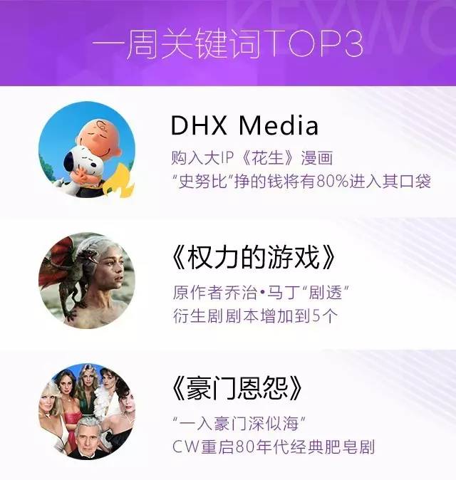 DHX Media收购《花生》和《草莓娃娃》品牌所有权;华纳兄弟国际部执行副总裁将在今夏离职;《权力的游戏》原作者乔治·马丁透露,衍生剧的剧本已增加到5个;Sky和HBO联合委制《年轻的教宗》续篇;CW重启《豪门恩怨》;Cartoon Network预订《乐高大电影》衍生动画。
