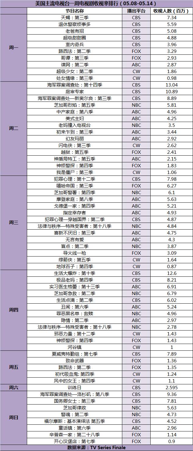 CBS《海军罪案调查处》《生活大爆炸》《庭审专家》获得上周剧集收视排行榜前三名,收视观众分别为1304万、1260万和1089万。综艺节目方面,表现最好的仍是老牌模式节目。其中,ABC的《与星共舞》(Dancing with the Stars)以985万观众获得综艺节目收视冠军,NBC《好声音》(The Voice)以914万观众排在第二位,第三名则是CBS的《幸存者》(Survivor),收视观众为816万。