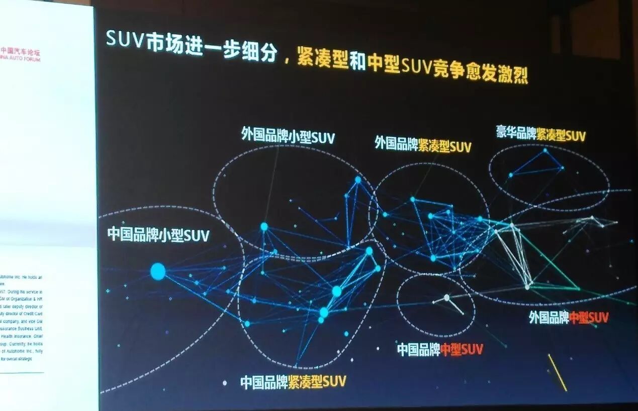 第二部分讲一下竞争方面的格局分析,我们看一下云图,第一个是中国品牌的整体竞争力再往日韩系靠近。这是个云图,靠得近的,竞争关系越近,线条越粗,竞争越激烈。这块是中国品牌,可以看到量再往韩系、日系那边走。SUV的市场看一下,紧凑型和中型的竞争会越来越激烈,这是个云图。中国品牌紧凑型在下面,它跟国外品牌也是越走越近,而且越搞越密。当然中国品牌紧凑型的SUV对上了国外小型,中型对上了他们的紧凑型。这是紧凑型的SUV市场,去年12月份竞争格局。这里面可以看到,韩系的车跟我们靠近,到了今年三月份,韩系车跟我们已经走到一块儿来了。可能也有政治的因素,但是至少从图上来看,跟中国品牌走到一起了。
