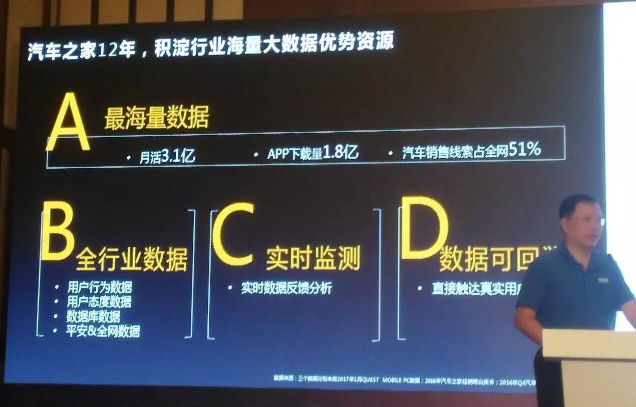 汽车之家CEO陆敏在2017年中国汽车论坛上表示,中国用户在购车前要在网上搜索、比照三个月至6个月,购车后会在网上作出评论,都会留下印记,产生实时的数据,汽车之家可以通过大数据分析,给大家展示未来的市场、竞争格局、以及用户需求的变化。